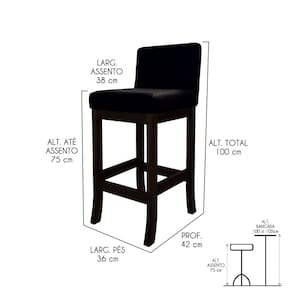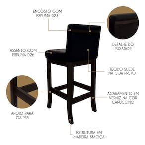A Banqueta Alta Melody é uma peça de destaque para qualquer ambiente, produzida em Madeira Maciça com acabamento em Verniz, garantindo durabilidade e elegância. Seu assento e encosto preenchidos com Espuma D26 e D23, respectivamente, oferecem o máximo conforto para refeições e momentos de descontração. Além disso, o revestimento em Tecido Suede confere um toque moderno e versátil. Seja na cozinha, sala de jantar ou espaço gourmet, essa banqueta é a escolha perfeita para agregar charme e funcionalidade ao lar! CARACTERÍSTICAS TÉCNICAS: - Produzido em Madeira Maciça; - Acabamento em Verniz na cor Capuccino; - Assento Preenchido com Espuma D26; - Encosto Preenchido com Espuma D23; - Revestimento em Tecido Suede na cor Preto. *Indicada para Bancadas/Mesas com Alt. 100/105cm. *PRODUTO ENVIADO MONTADO. INFORMAÇÕES TÉCNICAS: Altura Total: 100 Cm Altura até Assento: 75 Cm Altura até Travessa: 23 Cm Altura Encosto: 35 Cm Largura Assento: 38 Cm Largura Estrutura: 36 Cm Profundidade Total: 42 Cm Profundidade Assento: 41 Cm Peso: 7 kg INFORMAÇÕES ADICIONAIS: ATENÇÃO: Móvel produzido em madeira maciça natural podendo ocorrer mudança no tom da madeira conforme o produto. *Conferir se o produto está de acordo com o que comprou, produto danificado não será aceito troca. **As imagens ambientadas são meramente ilustrativas e podem apresentar itens que não compõe o produto. As cores do produto podem variar de acordo com o monitor, a iluminação do ambiente ou sua percepção visual. ***Limpeza deve ser feita com pano macio e seco ou levemente umedecido com água e sabão neutro. Não devem ser utilizados produtos abrasivos. Garantia para defeitos de fabricação conforme Código de Defesa do Consumidor. Marca: Ccs Interiores