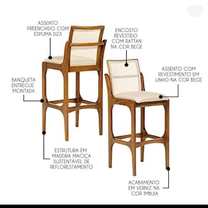 A Banqueta Alta Lisboa é o modelo ideal para complementar o seu ambiente. Dispõe de um design atual com assento estofado e encosto em rattan. As banquetas são móveis versáteis que podem ser utilizados em diversos ambientes e funcionalidades, petindo composições na decoração e agregando conforto e sofisticação ao ambiente. Podem ser utilizadas em bancadas de salas conjugadas, mesas bistrô em sacadas gourmet ou aonde você precisar. Produzida com madeira maciça, garantindo a sua durabilidade e vida útil. CARACTERÍSTICA TÉCNICAS: - Produzido em Madeira Maciça Sustentável - Acabamento em Verniz na cor Imbuia - Assento Estofado Preenchido com Espuma D23 - Encosto com Revestimento em Rattan em Fibra de Algodão Sextavada na cor Bege - Tecido de Alta Qualidade em Linho na cor Bege M58 - Banqueta Entregue Montado INFORMAÇÕES TÉCNICAS: - Altura Total: 108 cm - Altura até o Assento: 75 cm - Largura Total: 43 cm - Profundidade Total: 46 cm INFORMAÇÕES ADICIONAIS: Garantia para defeitos de fabricação conforme Código de Defesa do Consumidor. - ATENÇÃO: Não nos responsabilizamos pela montagem, subir ou içar o móvel. - As imagens ambientadas são meramente ilustrativas e podem apresentar itens que não compõe o produto, as cores do produto podem variar de acordo com o monitor, a iluminação do ambiente ou sua percepção visual. - Limpeza: Deve ser feita com pano macio e seco ou levemente umedecido com água e sabão neutro. Não devem ser utilizados abrasivos. Marca: Império das Banquetas
