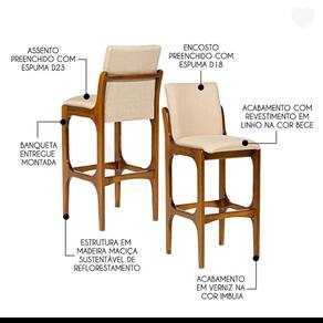A Banqueta Alta Lisboa é o modelo ideal para complementar o seu ambiente. Dispõe de um design atual com assento e encosto estofado dando um conforto único ao móvel. As banquetas são móveis versáteis que podem ser utilizados em diversos ambientes e funcionalidades, permitindo composições na decoração e agregando conforto e sofisticação ao ambiente. Podem ser utilizadas em bancadas de salas conjugadas, mesas bistrô em sacadas gourmet ou aonde você precisar. Produzida com madeira maciça, garantindo a sua durabilidade e vida útil. CARACTERÍSTICA TÉCNICAS: - Produzido em Madeira Maciça - Acabamento em Verniz na cor Imbuia - Assento Estofado Preenchido com Espuma D23 - Encosto Estofado Preenchido com Espuma D18 - Tecido de Alta Qualidade em Linho na cor Bege M58 - Banqueta Entregue Montado INFORMAÇÕES TÉCNICAS: - Altura Total: 108 cm - Altura até o Assento: 75 cm - Largura Total: 43 cm - Profundidade Total: 46 cm INFORMAÇÕES ADICIONAIS: Garantia para defeitos de fabricação conforme Código de Defesa do Consumidor. - ATENÇÃO: Não nos responsabilizamos pela montagem, subir ou içar o móvel. - As imagens ambientadas são meramente ilustrativas e podem apresentar itens que não compõe o produto, as cores do produto podem variar de acordo com o monitor, a iluminação do ambiente ou sua percepção visual. - Limpeza: Deve ser feita com pano macio e seco ou levemente umedecido com água e sabão neutro. Não devem ser utilizados abrasivos.