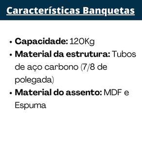 Banqueta Alta Preta Junco Argila com Assento Amarela FortmixSeja para acompanhar um café rápido no início do dia ou aquela confraternização especial com os amigos, a Banqueta Alta com Encosto será uma grande aliada na composição do seu espaço. Modelo alta, ela é ideal para acompanhar bancadas e balcões, seja na sala de jantar, espaço de churrasqueira ou até mesmo em seu estabelecimento comercial.Com design simples que conta com cor sóbria e junco, a peça embeleza o seu espaço ao mesmo tempo que garante a comodidade ideal, afinal, o assento preenchido em espuma recebe superbem o corpo além do suporte para os pés. Produto que faz toda diferença no seu ambiente.Características da Banqueta Alta com Encosto JuncadoCor da Estrutura: PretaCor do Assento: AmarelaCapacidade (kg): 120 kgMaterial da estrutura: Tubos de Aço carbono (7/8 de polegada)Material do assento: MDF e EspumaEncosto: Junco ArgilaDimensões da Banqueta Alta com Encosto Juncado Altura do assento até o chão (cm): 72 CmAltura do encosto até o chão (cm): 95 CmDiâmetro do assento: 32 CmConteúdo da Embalagem: 01 Banqueta Alta com Encosto JuncadoDicasNão deixe suas banquetas expostas ao sol por mais de 4 horas.Não use produtos abrasivos na limpeza de suas Banquetas.Usar um pano umedecido na limpeza da Banqueta e, logo em seguida, seque-as com um pano seco.A tonalidade da cor pode variar de acordo com o lote do fabricante e/ou as configurações de seu monitor.*Imagens meramente ilustrativasGarantia3 Meses contra defeito de fabricação
