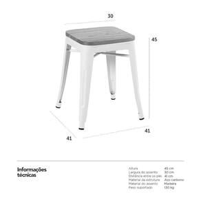 Material da estrutura: Aço carbono Material do assento: Madeira Altura: 45 cm Largura do assento: 30 cm Largura dos pés: 41 cm Peso suportado: 130 kg Garantia: 3 meses