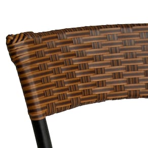 O acabamento externo é feito em fibra sintética tramada artesanalmente, com tratamento anti-UV, o que permite seu uso tanto em ambientes internos quanto externos, inclusive exposta ao sol.