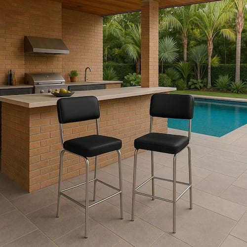 Banqueta Alta Vintage com Assento e Encosto Sintético Preto , Pés Aço Cromados
