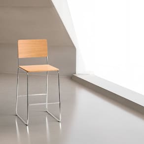 Estrutura em tubo de aço redondo de meia polegada parede 1.5mm. Assento reto e encosto curvado, em compensado multilaminado com acabamento em formica. Sapata plástica.