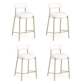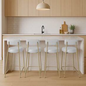 Banqueta Cozinha Alta Com Encosto Industrial Champanhe Kit 4 Londres Pu Branco D03 - D'rossi Renove sua cozinha, área gourmet ou ambiente comercial com o kit 4 Banquetas Alta Londres em sintético PU Branco. Com 95 cm de altura total e 75 cm do assento ao chão, possui a proporção perfeita para bancadas e ilhas altas, garantindo conforto e ergonomia em cada uso. A estrutura em aço carbono na champanhe combinada à madeira de reflorestamento assegura resistência e durabilidade, enquanto o acabamento em pintura epóxi protege e realça o visual industrial da peça. O assento e o encosto fixos, estofados em espuma D-26 de alta densidade, proporcionam maciez e sustentação ideais. O revestimento agrega sofisticação e é fácil de limpar, mantendo o aspecto elegante por muito mais tempo. Seu design industrial apresenta base metálica vazada, que traz leveza visual e robustez estrutural, além de apoio para os pés integrado e capacidade para até 120 kg com total . A Banqueta Londres é a escolha certa para quem busca elegância, praticidade e conforto em um só produto. Dimensões do Produto: