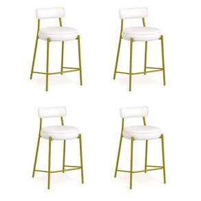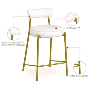 Banqueta Cozinha Alta Com Encosto Industrial Dourado Kit 4 Londres Pu Branco D03 - D'rossi Renove sua cozinha, área gourmet ou ambiente comercial com o kit 4 Banquetas Alta Londres em sintético PU Branco. Com 95 cm de altura total e 75 cm do assento ao chão, possui a proporção perfeita para bancadas e ilhas altas, garantindo conforto e ergonomia em cada uso. A estrutura em aço carbono na dourada combinada à madeira de reflorestamento assegura resistência e durabilidade, enquanto o acabamento em pintura epóxi protege e realça o visual industrial da peça. O assento e o encosto fixos, estofados em espuma D-26 de alta densidade, proporcionam maciez e sustentação ideais. O revestimento agrega sofisticação e é fácil de limpar, mantendo o aspecto elegante por muito mais tempo. Seu design industrial apresenta base metálica vazada, que traz leveza visual e robustez estrutural, além de apoio para os pés integrado e capacidade para até 120 kg com total segurança. A Banqueta Londres é a escolha certa para quem busca elegância, praticidade e conforto em um só produto. Dimensões do Produto: