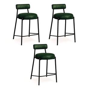 Banqueta Cozinha Alta Com Encosto Industrial Preto Kit 3 Londres Pu D03 - D'rossi Cor Verde Renove sua cozinha, área gourmet ou ambiente comercial com o kit 3 Banquetas Alta Londres em sintético PU. Com 95 cm de altura total e 75 cm do assento ao chão, possui a proporção perfeita para bancadas e ilhas altas, garantindo conforto e ergonomia em cada uso. A estrutura em aço carbono na cor preta combinada à madeira de reflorestamento assegura resistência e durabilidade, enquanto o acabamento em pintura epóxi protege e realça o visual industrial da peça. O assento e o encosto fixos, estofados em espuma D-26 de alta densidade, proporcionam maciez e sustentação ideais. O revestimento agrega sofisticação e é fácil de limpar, mantendo o aspecto elegante por muito mais tempo. Seu design industrial apresenta base metálica vazada, que traz leveza visual e robustez estrutural, além de apoio para os pés integrado e capacidade para até 120 kg com total segurança. A Banqueta Londres é a escolha certa para quem busca elegância, praticidade e conforto em um só produto. Dimensões do Produto: