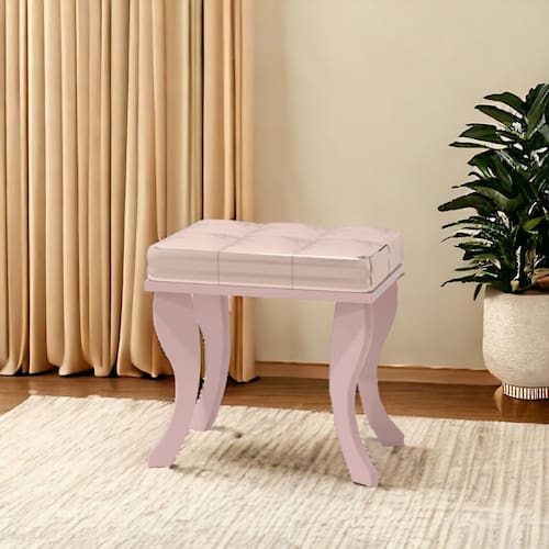 Essa banqueta estofada para penteadeira infantil é um assento projetado para crianças, com acolchoamento para maior conforto e revestimento na cor rose.