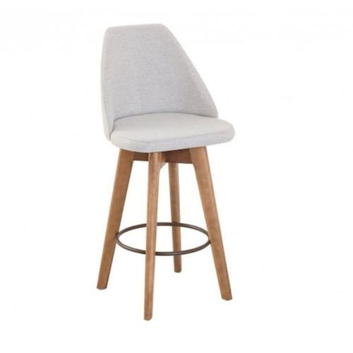 - Altura Total: 107cm; - Largura Total: 48,5cm; - Profundidade Total: 41cm; - Altura do chão até o assento: 72cm. - Assento revestido com espuma D-23; - Base Giratória em madeira de Eucalipto; - Arco redondo em ferro; - Assento em tecido; - Suporta até 120kg.