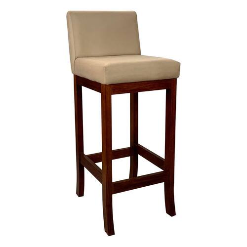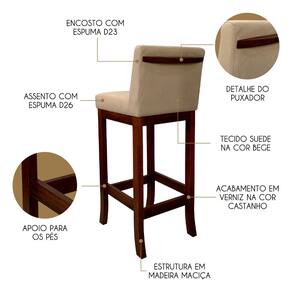 CARACTERÍSTICAS TÉCNICAS: - Produzido em Madeira Maciça; - Acabamento em Verniz na cor Castanho; - Assento Preenchido com Espuma D26; - Encosto Preenchido com Espuma D23; - Revestimento em Tecido Suede na cor Bege.