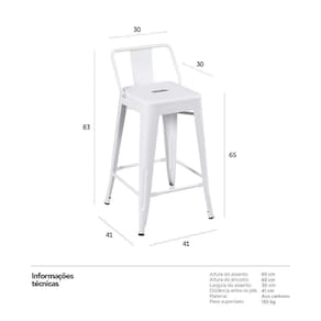 Altura do assento: 65 cm Ideal para bancadas com altura entre 85 e 90 cm Largura do assento: 30 cm Distância entre os pés: 41 cm Material: Aço carbono Peso suportado: 130 kg
