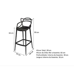 Material: Polipropileno -Altura do encosto: 99 cm -Altura do assento: 66 cm -Largura do assento: 35 cm - Profundidade do assento: 38 cm - Distância entre os apoios de braços: 50 cm - Distância entre os pés: 51 cm - Peso suportado: 120 kg - Garantia: 3 meses.