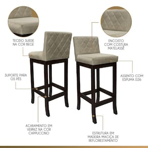 A banqueta Tóquio é a fusão perfeita entre requinte e comodidade. Fabricada com madeira maciça proveniente de reflorestamento e acabamento em verniz, sua estrutura promove durabilidade e um charme natural. O assento, preenchido com espuma D26, e o encosto, com espuma D23, proporcionam um suporte ergonômico incomparável. O toque de elegância é evidenciado pelo detalhe da costura matelassê no encosto, enquanto o revestimento em suede adiciona um acabamento luxuoso. A banqueta Tóquio é a escolha ideal para elevar o conforto e a sofisticação de qualquer ambiente. CARACTERÍTICAS TÉCNICAS: - Produzido em Madeira Maciça de Reflorestamento; - Acabamento em Verniz na cor Capuccino; - Assento Preenchido com Espuma D26; - Encosto Preenchido com Espuma D23; - Encosto com Costura Matelassê; - Revestimento em Suede na cor Bege. *Indicada para Bancadas/Mesas com Alt. 90/95cm. *PRODUTO ENVIADO MONTADO. INFORMAÇÕES TÉCNICAS: Altura Total: 90 Cm Altura até Assento: 65 Cm Altura até Travessa: 13 Cm Altura Encosto: 35 Cm Largura Assento: 38 Cm Largura Estrutura: 36 Cm Profundidade Total: 42 Cm Profundidade Assento: 41 Cm Peso: 7 kg INFORMAÇÕES ADICIONAIS: ATENÇÃO: Móvel produzido em madeira maciça natural podendo ocorrer mudança no tom da madeira conforme o produto. *Conferir se o produto está de acordo com o que comprou, produto danificado não será aceito troca. **As imagens ambientadas são meramente ilustrativas e podem apresentar itens que não compõe o produto. As cores do produto podem variar de acordo com o monitor, a iluminação do ambiente ou sua percepção visual. ***Limpeza deve ser feita com pano macio e seco ou levemente umedecido com água e sabão neutro. Não devem ser utilizados produtos abrasivos. Garantia para defeitos de fabricação conforme Código de Defesa do Consumidor. Marca: CCS Interiores