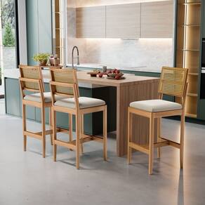 Apresentamos a você as banquetas Milena, estruturadas em madeira maciça com tela palha sextavada nos encostos, assentos estofados com espuma D-23.