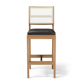 Apresentamos a você a banqueta Milena, estruturada em madeira maciça na cor castanho com telinha no encosto, assento estofado com espuma D-23.