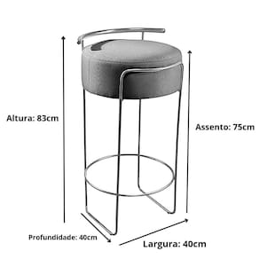 Altura 83 cm Profundidade 40 cm Largura 40 cm Altura do Assento 75 cm Peso 7 kg Formato do assento Redondo Peso suportado por assento 150 kg Tecido Linho Material da Estrutura Metal Assento Espuma D26 soft 3cm espessura Exige montagem? Não, apenas ajuste dos pés