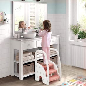 Banquinho infantil para pia de banheiro, banquinho infantil de 3 degraus com alças de segurança, escada de três degraus para ajudante de cozinha, cama, toalete para treinar o penico, banquinho antiderrapante para aprender bebês, branco e rosa — Banquinho multiuso: nosso banquinho