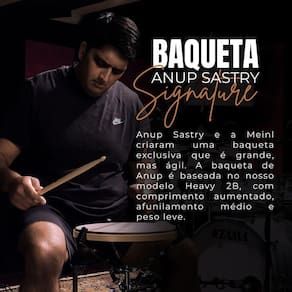 Baqueta meinl stick & brush signature anup sastry Anup sastry e a meinl desenvolveram uma baqueta signature que é grande, mas ágil. O modelo de anup tem como base a nossa heavy 2b, com comprimento aumentado, afilamento médio e peso leve. Essa combinação oferece grande alcance e potência, mantendo um toque leve e responsivo - sem parecer pesada ou lenta. Uma camada extra de verniz fino foi aplicada para melhorar a aderência. como uma baqueta maior, ela é muito bem equilibrada. Nem muito pesada, nem muito leve. Sempre quis uma baqueta um pouco mais longa e grossa que uma 2b padrão, mas que não fosse pesada ou cansativa. Ela une o melhor dos dois mundos: as dimensões de uma baqueta grande com o peso de algo mais leve e ágil.