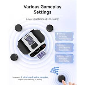 - [Jogo personalizado e desenho fácil de cartas] - Personalize sua experiência de jogo com configurações ajustáveis para contagem de cartões, direção e distância de negociação. Seja jogando pôquer, UNO ou Five Crowns, este versátil embaralhador de cartas e dealer se adapta a várias regras. Os 4 controles remotos sem fio incluídos permitem que os jogadores tirem cartas sem esforço, simplificando o gerenciamento de jogos que exigem desenho frequente de cartas. Se houver mais de quatro jogadores, compartilhe um controle remoto com o jogador próximo a você
