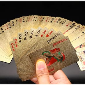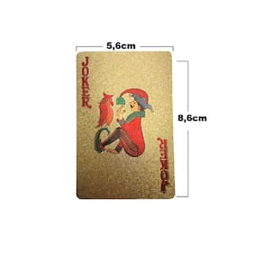 Folheado a ouro e à prova d’água, o baralho apresenta números em preto e vermelho, além de naipes coloridos que garantem uma leitura fácil e visual marcante.