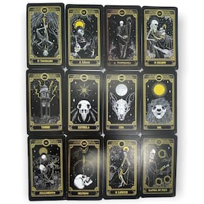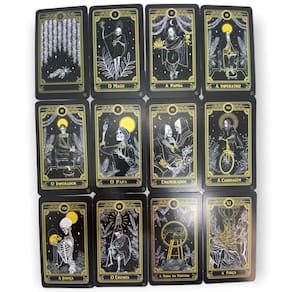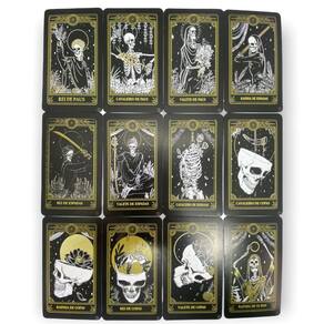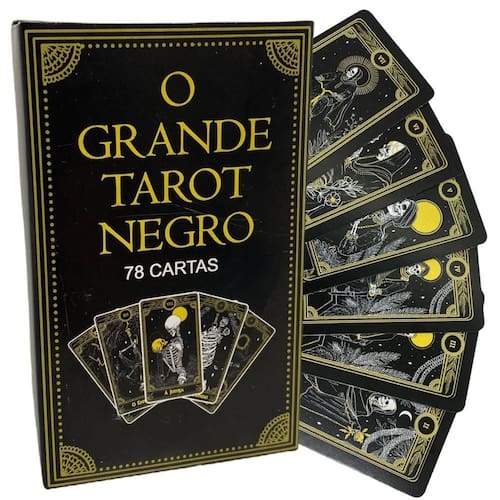 Baralho o Tarot Negro 78 Cartas sendo 22 arcanos maiores e mais 56 cartas intuitivas com manual explicativo Ao fazer a leitura das cartas do Tarot Negro de forma aleatória, adquirimos respostas para diferentes nas questões importantes em todas as áreas de nossas vidas. Especificações técnicas: Peso: Dimensões da caixa 65 mm de largura 27 mm de altura 115 mm de Comprimento Design impressionante, simples e sofisticado, com boa leitura, com personagens misteriosos e estilosos, figuras com crânios e esqueletos com tons em preto, dourado e branco. Boa qualidade de impressão, resolução Ilustrações bem definidas. Ótimo deslize, portanto, são mais difíceis de amassar. Contém 1 manual explicativo com 30 páginas Contém 78 cartas, sendo 22 arcanos maiores com identificação impressa, e as demais 56 cartas que são os arcanos menores não tem a identificação impressa são cartas intuitivas Marca: Flor De Magia