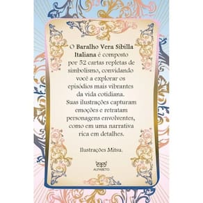 Mergulhe na Tradição da Cartomancia Italiana! Diretamente do século XIX para as suas mãos, o Vera Sibilla Italiana chega como uma joia rara da adivinhação! Com 52 cartas ricamente ilustradas, esse baralho nasceu na Itália por volta de 1880 e carrega toda a elegância e profundidade da cartomancia clássica. Cada carta é um espelho da alma, trazendo símbolos arquetípicos e figuras que dialogam entre si, revelando segredos do inconsciente com precisão surpreendente. Uma jornada esotérica pelo cotidiano humano, com imagens que facilitam a interpretação, mesmo aos iniciantes. Se você ama Tarô, Lenormand ou simplesmente quer se conectar com um oráculo repleto de história e simbolismo, esse baralho é para você. Garanta já o seu e transforme suas leituras em experiências profundas e inesquecíveis! Lâminas com bordas douradas e caixa luxo reforçada. (Formato das 52 cartas: 6,3 x 9,5 cm) Marca: Não Informado