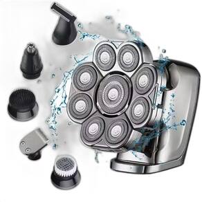 Barbeador cabeças ajustáveis barbear preciso Barbeador Elétrico 6 em 1 - Atualização 9D Este barbeador elétrico 6 em 1 é a solução completa para cuidados masculinos, oferecendo um aparador 9D com lâminas flexíveis que se ajustam aos contornos do rosto e cabeça, garantindo um barbear suave e eficiente. Ele vem com aparador de nariz, aparador de costeletas, escova de limpeza facial e facial, atendendo a todas as suas necessidades de cuidados com a barba e pele. A bateria oferece até 90 minutos de uso após 2 horas de carregamento rápido via USB, e o visor LED inteligente exibe a carga restante para maior praticidade. Seu design à prova d'água permite usá-lo no chuveiro ou com creme de barbear, e a limpeza é facilitada com as partes laváveis. Compacto e leve, pesa apenas 200g, o que o torna ideal para viagens. É a escolha perfeita de presente para pais, maridos ou amigos em datas especiais como Dia dos Pais, Natal ou Aniversários.