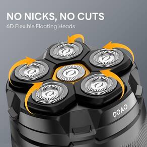 - Cabeça flexível 6D: Projetado para homens carecas, este barbeador possui uma cabeça flutuante 6D que se adapta aos contornos do couro cabeludo, garantindo um barbear rápido, suave e sem cortes.