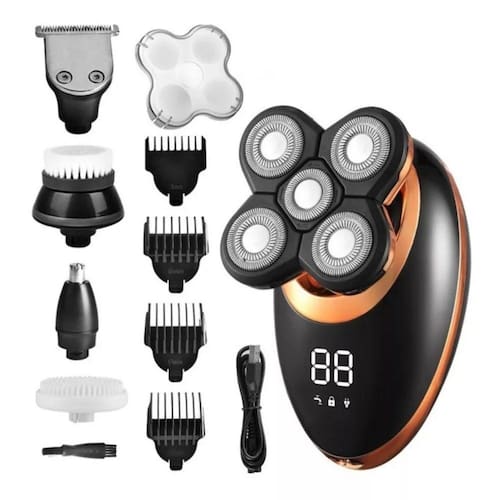Nome do produto: O conjunto de barbeador elétrico 4 em 1 e barbeador de barba com tela LED O indicador de bateria INCLUI: 1 cabeça de barbear. 1 aparador de cabelo para nariz. 1 escova de fácil limpeza.\ n\ n\ n1 x Escova de limpeza\ n\ n1 x USB.1 Instruções manuais\ n\ nFunções: Pode ser para barba e careca.\ n Limpeza facial confortável e fácil de limpar. Aparador de pelos do nariz e das orelhas. Aparador de aço de precisão com 4 protetores de corte para diferentes estilos de cabelo e barba. Características: Design ergonômico e silencioso: adota tecnologia de redução de ruído, design de baixo ruído. Quando ligado, o display LED inteligente pode mostrar a porcentagem de eletricidade. Lâminas de aço importadas: lâminas de alta qualidade para evitar alergias. Botão tudo-em-um: fácil de operar, muito atencioso para você. Forma de ovo: pequena, fácil de colocar na palma da mão para segurá-la com firmeza durante o barbear e não cai. Tensão global ideal para viagens\ nO design sem fio recarregável USB o torna mais confortável de usar. As cabeças de reposição são removíveis, fáceis de limpar com água corrente com a escova limpa. Especificações: Cor: Dourado. Material: ABS ambiental +aço inoxidável importado. Cabeças intercambiáveis: 4 cabeças removíveis para atender a mais necessidades. Tempo de carregamento: 2 horas de carregamento rápido. Impermeável: uso úmido e seco.