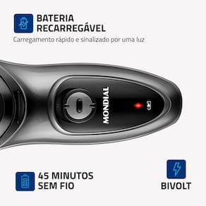 BATERIA RECARREGÁVEL: O carregamento é rápido, sinalizado por luz indicadora, e garante dias de uso. Esta função proporciona praticidade à sua rotina de barbear, pois garante mais tempo de uso, sem que você precise colocar o aparelho na tomada.