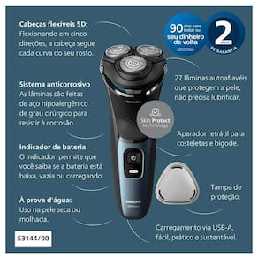 O barbeador elétrico de uso seco e molhado Philips série 3000 proporciona um barbear confortável e limpo, mesmo em peles sensíveis. As cabeças 5D Pivot e Flex, as 27 lâminas PowerCut autoafiáveis para uso seco ou molhado garantem sempre resultados excelentes e confiáveis. Possui 2 anos de garantia e 90 dias para testar. Cabeças de corte 5D Pivot & Flex Ao se mover e girar em cinco direções, a cabeça acompanha todas as curvas do seu rosto, cortando os pelos bem rente à pele e proporcionando um barbear limpo e confortável, mesmo em peles sensíveis. Lâminas PowerCut As 27 lâminas autoafiáveis cortam consistentemente os pelos bem rente à pele, proporcionando acabamento suave e uniforme, sempre. As lâminas autoafiáveis permanecem novas por 2 anos. Barbear a seco e com a pele molhada Escolha entre um prático barbear a seco ou um refrescante barbear úmido com gel ou espuma, até mesmo debaixo do chuveiro. 60 minutos de barbear sem fio Em apenas uma hora, a bateria durável de íon de lítio fica totalmente carregada para você se barbear por 20 vezes. Sistema de corte anticorrosão As lâminas do barbeador são feitas de aço cirúrgico hipoalergênico para resistir à corrosão, evitar impurezas e proteger sua pele. Aparador retrátil Refine e defina o bigode e as costeletas com o aparador retrátil e complete seu visual com facilidade. Abertura com um único toque Para abrir a cabeça do barbeador e lavá-la em água corrente, basta tocar em um botão. Empunhadura de borracha Nunca perca a sua pega. O cabo ergonômico em borracha proporciona conforto e segurança, mesmo quando molhado. Indicador de nível da bateria Não seja pego de surpresa por uma bateria vazia. O indicador da bateria permite que você saiba se a bateria está fraca, vazia ou sendo carregada. Carregamento USB-A Na Philips, impulsionamos a sustentabilidade em todos os aspectos da criação de produtos. Nossa ambição é diminuir o desperdício e reduzir o número de adaptadores USB que colocamos no mercado." Características Uso: Uso Molhado Tipo: Barbeadores Velocidades: 01 Quantidade de Lâmina/Pente: Tampa de proteção Aparador retrátil incluído Lâminas Hipoalergênicas Remove os Pelos pela Raiz Portátil Lavável Indicador de Carga Sistema Giratório Recarregável Uso/Operação: sem Fio Especificações Técnicas Modelo: S3144/00 Voltagem: Bivolt Cor: Azul profundo EAN: 8720689024594 Garantia: 24 meses Dimensões e Peso Dimensões do produto sem embalagem (AxLxP): 190x100x80 mm Dimensões do produto com embalagem (AxLxP): 205x169x209 mm Peso do produto sem embalagem: 0,32 Kg Peso do produto com embalagem: 0,47 Kg Itens Inclusos 01 Barbeador 01 Tampa de proteção Aparador retrátil incluído