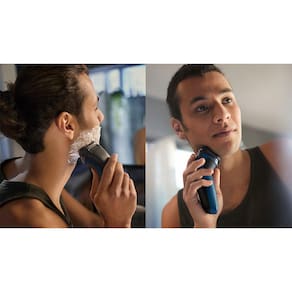 Barbear a seco e com a pele molhada Escolha entre um prático barbear a seco ou um refrescante barbear úmido com gel ou espuma, até mesmo debaixo do chuveiro.