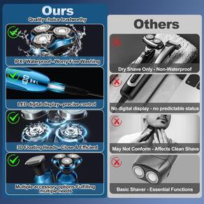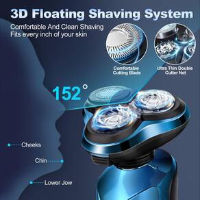 Para sua segurança, não use durante o carregamento. Desconecte o cabo de alimentação do barbeador antes de limpá-lo em água. ? Antes de usar, carregue totalmente a lâmina elétrica por 2 horas, para que ela não belisque sua barba e você possa desfrutar de um barbear poderoso e limpo. O queixo do lábio superior, bochechas, garganta... A barba está crescendo em direções diferentes no rosto e difícil de raspar? Não se preocupe. Nosso barbeador elétrico masculino flexível resolverá seus problemas e proporcionará uma experiência de barbear confortável todos os dias. ? Características do barbeador elétrico masculino: Cabeça flutuante 3D: as cabeças flutuantes 3D seguem automaticamente os contornos do seu rosto e pescoço para depilar efetivamente tanto a barba mais longa quanto a barba curta. Barbear rente e suave: as lâminas são projetadas para raspar a pele em movimentos laterais, garantindo um barbear suave extremamente próximo à pele. Molhado e seco: todo este barbeador é lavável, e use-o molhado ou seco, barbear com sabão ou creme obterá melhores resultados de barbear. Bateria de lítio durável: com uma bateria de lítio de grande capacidade, o barbeador elétrico pode ser totalmente carregado em 2 horas e pode ser utilizado por 90 minutos de cada vez. Parceiro de viagem perfeito: o barbeador elétrico masculino pode ser colocado em uma pasta e estar com você em qualquer lugar. ?Especificação: Tempo de carregamento da bateria (quando a bateria está vazia): 2 horas. Tempo de barbear: 90 minutos. Bateria: 1 bateria de íon-lítio. Tensão nominal: 100V-240V. Tensão de entrada: 5V. Conteúdo da embalagem: 1 barbeador elétrico. 3 pentes guia (3 mm, 5 mm, 7 mm) 1 x cabeça de aparador de costeletas 3 lâminas substituíveis. 1 cabo USB de carregamento. 1 bolsa de pano de viagem. 1 escova de limpeza. 1 manual de instruções (idioma português não garantido). - ?Barbeador elétrico para homens?O barbeador de barba masculino flutuante 3D com lâminas de aço inoxidável de trilho duplo se encaixa nos contornos do rosto, pescoço e até mesmo queixo para um barbear rápido e limpo. As bordas arredondadas se movem suavemente sobre a pele para reduzir a irritação, proporcionando uma experiência suave, próxima e confortável. Este barbeador masculino elétrico está equipado com um boné de motor potente de alta velocidade com qualidade premium para proporcionar um barbear silencioso. - ?IPX7 à prova d'água e uso úmido/seco?Este barbeador elétrico masculino é um corpo inteiro à prova d'água IPX7, permite que você use este barbeador molhado ou seco mesmo no chuveiro. Adapta-se facilmente à espuma de barbear ou ao gel para uma experiência de barbear mais confortável. A cabeça de barbear removível e o corpo lavável facilitam a limpeza diretamente sob a torneira, e todas as peças eletrônicas dentro do barbeador estão protegidas. - ?Lâminas de barbear e aparador de substituição?Este barbeador elétrico para rosto masculino vem com 3 lâminas de substituição extras para ajudar a prolongar a vida útil do seu barbeador elétrico. Se a cabeça da lâmina ficar cega, você pode substituí-la por uma nova quantas vezes quiser para uma nova experiência de barbear. Equipado com 1 aparador de barba para homens e 3 tamanhos diferentes de pentes guia (3 mm, 5 mm, 7 mm), facilita cortar sua barba favorita ou visual de costeletas. Satisfaça todas as suas necessidades de corte de cabelo e cuidados faciais. - ?4 luzes de LED inteligentes?1. Visor LED de cristal líquido, status da bateria de 0% a 100% para lembrar você de recarregar; 2. O ícone de carregamento acende enquanto conecta e ajuda você a confirmar se o status de carregamento é normal. 3. O sinal Tap lembrará você de limpá-lo para obter um melhor efeito de barbear. 4. Função de bloqueio de viagem inteligente (pressione o botão liga/desliga por 3 segundos) pode evitar a abertura acidental durante a viagem. Barbeadores de viagem perfeitos para homens. - ?Corte rápido e fechado?Os barbeadores elétricos masculinos para depilar o rosto são equipados com 3 cabeças elétricas flutuantes masculinas de anel duplo feitas de material de aço inoxidável de nível de aviação, o que aumenta a área de contato do barbear, seu motor de alta velocidade, rede esférica ultrafina de trilha dupla, autoafiação. A combinação de lâminas de aço ajusta automaticamente o ajuste de acordo com os contornos do rosto, pescoço e queixo para um barbear mais limpo e um barbear de fechamento rápido.