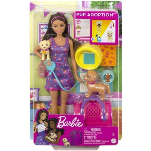 Barbie Conjunto Adota Cachorrinhos Negra - Mattel A Barbie vai adotar cachorrinhos com o conjunto Pup Adoption. As peças para contar histórias permitem que os jovens amantes de bichinhos se tornem novos tutores de cães e cuidem, alimentem e treinem dois adoráveis filhotes. A transformação com a mudança de cor acrescenta diversão à brincadeira na hora de comer e de usar o banheiro, e uma caixa de transporte de animais amplia a brincadeira do cuidado. A boneca não fica em pé sozinha. As cores e as decorações podem variar. Selo Inmetro: 00128-04A Ean: 194735101764
