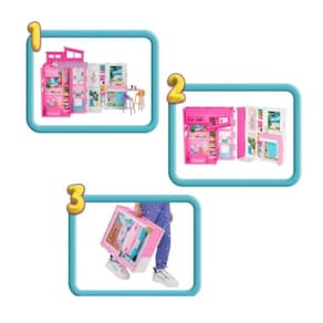 Essa linda, colorida e dobrável casa de boneca Barbie inspira muita diversão e inúmeras aventuras Ela vem com uma boneca Barbie, além de acessórios charmosos para decoração. Com quatro áreas de brincadeira para estimular a contação de histórias - cozinha, banheiro, quarto no sótão e canto do filme - a Barbie Casa Glam é um presente perfeito para crianças a partir de 3 anos de idade.