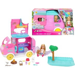 As crianças podem levar a boneca Chelsea e seus dois animais de estimação em uma viagem com o trailer Barbie Chelsea 2 em 1 que se transforma em um acampamento legal Abra o veículo de brinquedo e monte o acampamento - vire o teto para criar uma piscina e coloque a árvore e a rede para se divertir sob o sol Crie um espaço para refeições com o painel e durma sob as estrelas no quarto da cobertura -- 14 peças temáticas inspiram a imaginação e a narrativa A pequena boneca Chelsea leva seu cachorrinho e coelho para o passeio; expanda as oportunidades de jogo com acessórios como fogueira, violão e comida para Chelsea e seus animais de estimação Quando chegar a hora de seguir em frente, as crianças podem fechar o trailer e empurrar para a próxima aventura