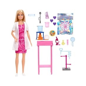 A Barbie Cientista vem com um jaleco branco e óculos de proteção, incentivando o reconhecimento de elementos de uma profissão real.