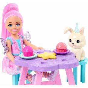 A Chelsea Barbie usa uma roupa rosa brilhante inspirada no visual de Barbie A Touch of Magic. Ela está pronta para passar o dia com pegasus e o coelhinho mágico de estimação!