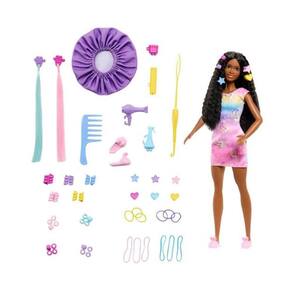 Jovens estilistas podem criar inúmeros penteados para a boneca Barbie com este conjunto que inclui mais de 50 peças para se divertir com penteados! Há uma ferramenta e um pente para fazer miçangas, um secador de cabelo de brinquedo e muitos acessórios para o cabelo, como extensões de cabelo coloridas, miçangas, elásticos e um gorro. As crianças podem criar um visual, encenar uma história e depois mudá-la para algo completamente diferente. A boneca Barbie Brooklyn pode se preparar para o dia usando pijamas fofos e chinelos adoráveis. Com tantas maneiras de estimular a criatividade das crianças.