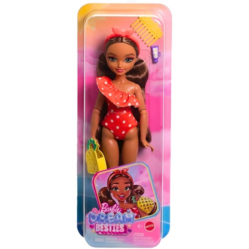 Descrição do produto : As bonecas Barbie Dream Besties incentivam as crianças a compartilhar suas personalidades únicas e suas modas com o mundo! Veja a Barbie "Malibu", a Barbie "Brooklyn", a Teresa e a Renee vestidas com seus trajes de banho estampados! As bonecas fashion incluem acessórios com tema de praia e cabelos compridos para que você se divirta com o estilo. As bonecas Barbie Dream Besties inspiram crianças a partir de 4 anos de idade a viverem seus sonhos. A boneca não pode ficar em pé sozinha. As cores e as decorações podem variar. : Detalhes técnicos : Marca: Mattel : Referência: JGH85 : Idade recomendada: 3 : Material: Plastico : Ean: 194735314515 : Peso (kg): 0,23 : Dimensões aproximadas da embalagem: 32 x 12 x 5 cm :