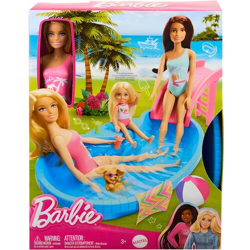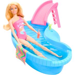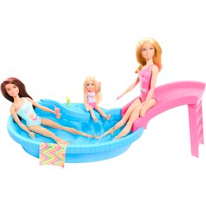 Descrição do produto : Você pode mergulhar na diversão de verão com a boneca Barbie e sua piscina! É fácil de encher e esvaziar, para uma festa na piscina. Ajude a Barbie a subir a escada e descer pelo escorregador, depois relaxe na água com uma bebida refrescante! Com uma estética bonita e colorida que fará barulho na hora de brincar. Para crianças a partir de 3 anos de idade. A boneca Barbie não pode nadar ou ficar em pé sozinha. As cores e as decorações podem variar. :