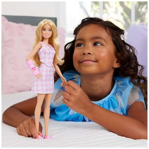 Ela usa o cabelo loiro solto, levemente ondulado, em comprimento abaixo dos ombros, pronto para ser penteado e estilizado. O visual é composto por blusa xadrez e saia xadrez coordenadas, formando um conjunto em tons modernos, combinado com mocassins rosa nos pés. O gesso rosa tem desenhos como coração e a assinatura “Barbie”, funcionando como acessório visual e elemento de história (acidente, recuperação, etc.).