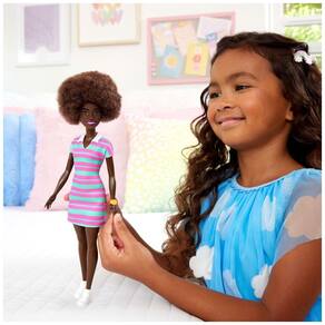 A Barbie Fashionistas #247 apresenta corpo petite e cabelo preto cacheado, com visual casual e colorido para o dia a dia. Ela veste um vestido com gola, em estilo camisaria, com listras alternadas em rosa chiclete e verde menta. Os acessórios incluem relógio laranja no pulso e tênis brancos, completando um look confortável para passeios e momentos com amigos. Indicada para crianças a partir de 3 anos, a boneca não fica em pé sozinha. ? Ficha Técnica