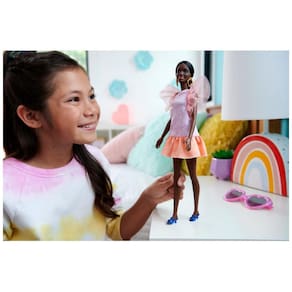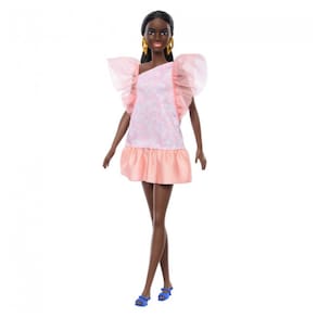 Marca: Barbie ?Fabricante: Mattel Linha/Coleção: Barbie Fashionistas – 65th Anniversary Número da boneca: 216 Nome do produto: Barbie Fashionistas Doll #216 with Tall Body & Black Hair in Low Ponytail in Pink & Peach Party Dress, 65th Anniversary Ano de lançamento: 2023 Modelo: HRH14 Faixa etária recomendada: A partir de 3 anos Tipo de corpo: Corpo alto (tall) Cor do cabelo: Preto, liso, em rabo de cavalo baixo Material da boneca: Plástico Vestido: Vestido curto rosa/pêssego com mangas bufantes em tecido transparente e babado na barra Acessórios inclusos: 1 par de sandálias azuis, 1 par de brincos geométricos Conteúdo da embalagem: 1 boneca Barbie Fashionistas #216 com vestido, 1 par de sandálias, 1 par de brincos Dimensões da embalagem (C x L x A): 3,4 cm x 7,3 cm x 29,8 cm Peso do produto: 0,17 kg Marca: Não Informado