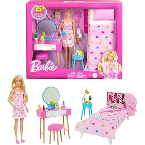 A Barbie está muito confortável neste conjunto de quarto Com cama, mesinha de cabeceira, penteadeira e muitos acessórios temáticos, as crianças podem brincar com a rotina da manhã e da hora de dormir ou inventar suas próprias histórias criativas. Detalhes, como um gatinho sonolento e um roupão macio, adicionam ainda mais charme ao conjunto. A boneca não fica em pé sozinha.