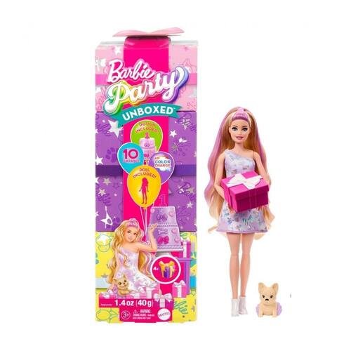 Com 10 surpresas em um pacote, as bonecas Barbie Party Unboxed oferecem uma experiência única de unboxing com embalagens inspiradas em caixas de presente e diversão com tema de aniversário de bichinhos de estimação
