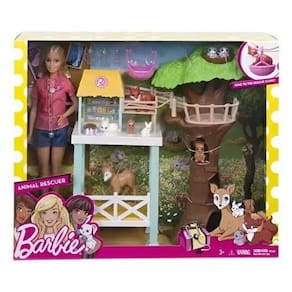 A boneca Barbie® ama animais, então ela está montando um centro de resgate -- onde eles vivem para cuidar deles! Com oito pacientes animais, este conjunto de boneca Barbie® e centro de resgate florestal permite que jovens amantes de animais resgatem animais. Há um filhote de veado, uma raposa, dois esquilos, dois coelhos e duas corujas. Projetado com um cenário natural, o colorido posto de cuidados (com dois níveis) é conectado a uma árvore por uma ponte de corda que funciona com a cesta de transporte de animais. A árvore apresenta muitos lugares para os animais menores descansarem, como o ninho em cima das folhas, buracos no tronco e uma plataforma entre os galhos. O posto de cuidados da boneca médica animal Barbie® combina com a árvore em dois andares de altura com elementos divertidos como um telhado de palha com o logotipo da Barbie® no topo, cores e decalques legais por toda parte e uma cama para animais abaixo. A boneca Barbie® está pronta para atender os pacientes vestindo uma camisa de colarinho, shorts jeans e botas. Um estetoscópio, duas mamadeiras e uma tigela de alimentação a ajudarão a cuidar dos animais. As imaginações jovens vão adorar realizar suas aspirações com este centro de resgate de animais porque com a Barbie®, você pode ser qualquer coisa! Inclui a boneca Barbie® usando roupas e acessórios, estação de cuidados, árvore, oito animais e acessórios. A boneca não fica em pé sozinha. As cores e decorações podem variar.
