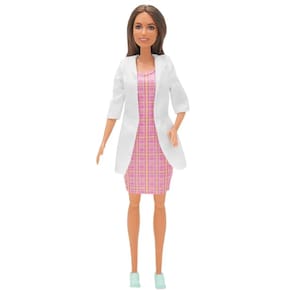 ROUPA E ACESSÓRIOS - ?Com um lindo vestido xadrez, jaleco branco de médico, estetoscópio e prancheta, a Barbie® médica (30,40 cm) está pronta para cuidar dos pacientes.