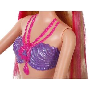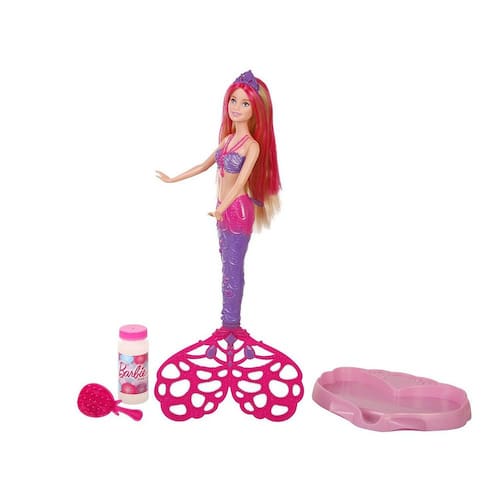 Boneca Barbie Fairy Sereia Bolhas Mágicas da Mattel. Esta linda sereia faz mais do que chamar a atenção. Ela faz bolhas, bolhas e mais bolhas! Vem com uma bandeja em formato de concha especial para colocar uma solução de bolhas de sabão. Uma solução de 60 ml já vem na caixa, para que a diversão comece imediatamente. Despeje-a na bandeja rosa, e então mergulhe a cauda da Barbie na solução e então retire. Basta puxar o cordão em suas costas várias vezes para que a cauda gire e crie muitas bolhas! Qualquer solução genérica para bolhas fará com que a mágica continue. A boneca vem com uma tiara e uma escova para facilitar na hora de arrumar os longos e lindos cabelos, com mechas cor-de-rosa. Com seu top e cauda ombré, ela vai se destacar, juntamente com as bolhas! Além da boneca com cauda giratória, vem com bandeja para solução de bolhas em formato de concha, uma tiara e 60 ml de solução para bolhas. Junte os amigos e divirta-se muito!