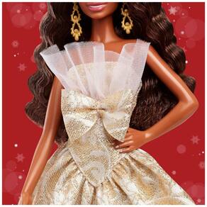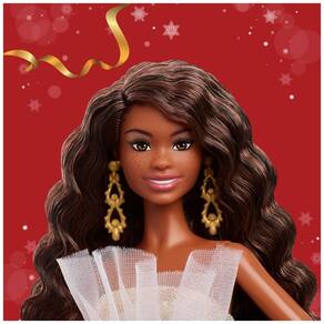 A boneca Barbie Holiday 2025 Signature com cabelo preto integra a linha sazonal de colecionador inspirada nas comemorações de fim de ano. O modelo utiliza vestido longo prata e dourado com estampa em padrão damasco, composto por saia volumosa e corpete tomara que caia. A gola é formada por acabamento em tule branco plissado com babado ao redor do colo, criando destaque na parte superior do traje.